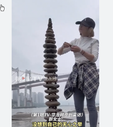 女生在江边搭石头塔垒到三十三层